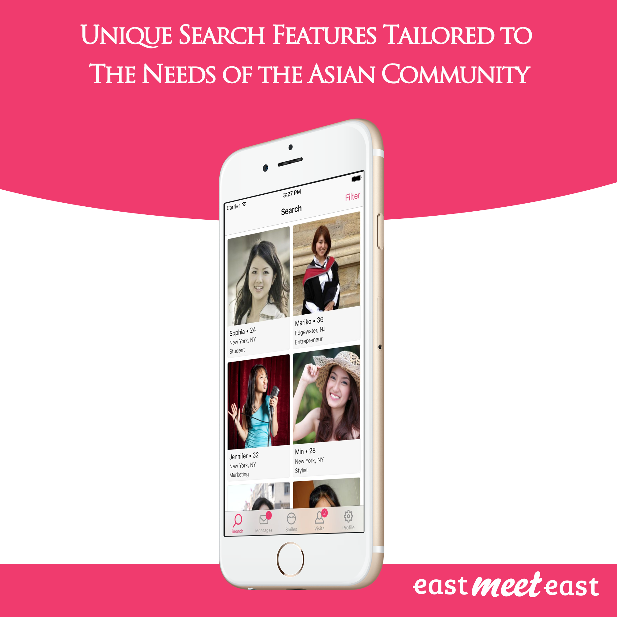 EastMeetEastは英語を主要言語としたアジア人を主に対象とした恋活・婚活マッチングサービスとして2013年11月にニューヨークでローンチして以来、急速に成長。その後ロサンゼルスおよびサンフランシスコなどの街に展開し、サイト・アプリ共に北米では定着しつつあります。サービスの特徴としては、米国移住時の年齢、母国語など、アジア人の関心事項に的を絞った項目を検索条件・アルゴリズム入れることによって、マッチングの成功率を最大化するところにあります。ニューヨーク市ウォール街が本社。共同創業者のCEO時岡真理子およびCTOの江島健太郎を含むチームがサービスの開発・マーケティングに携わっています。